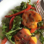 Sweet and salty are a perfect combination for a summer salad. Thinly sliced prosciutto envelopes ripe peach halves for this backyard dish. You can enjoy the peaches on their own as a fun appetizer idea too. Serve them with a drizzle of aged balsamic vinegar.