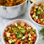 Serve in large bowls and top with diced tomato, avocado, sliced jalapeno pepper, cilantro, salsa and sour cream.